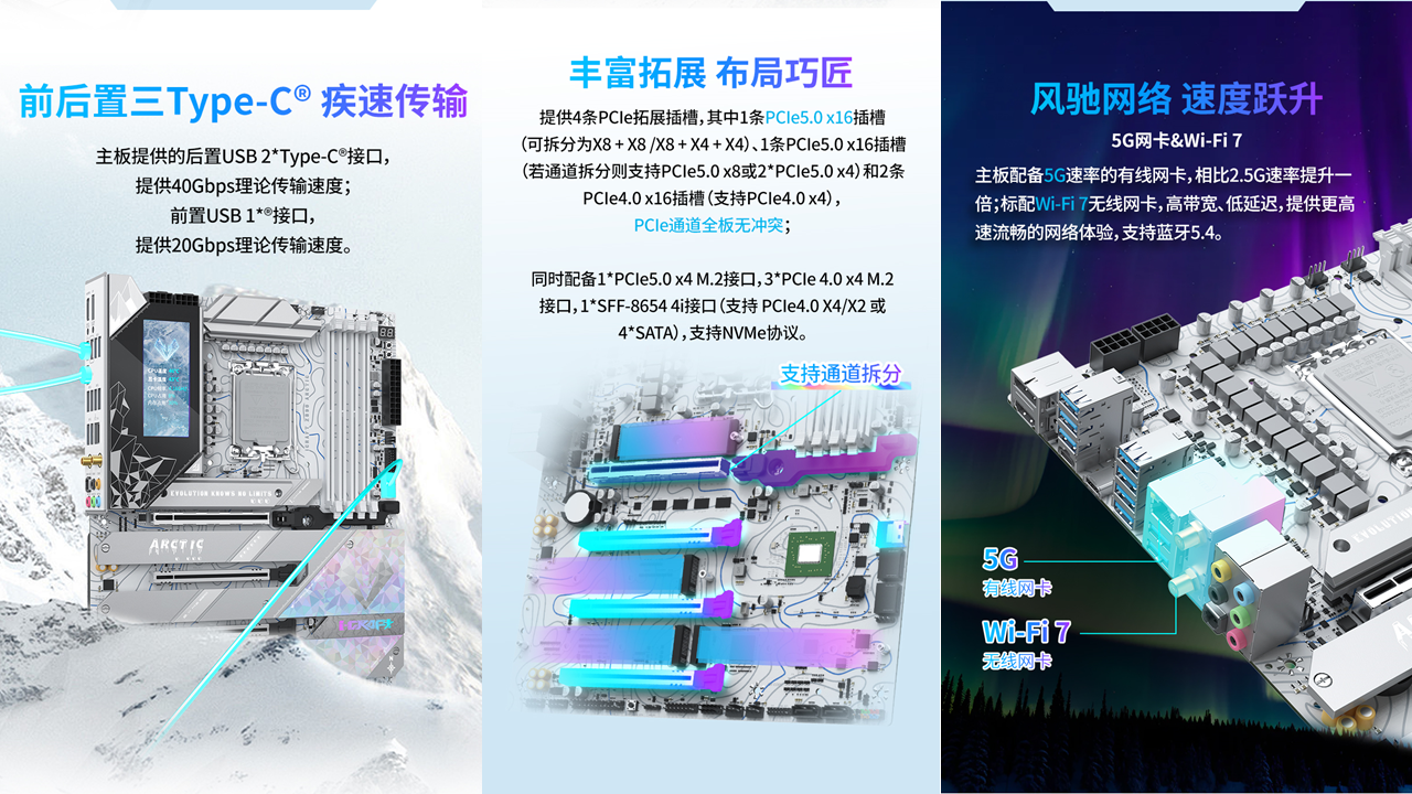 擴展方面,提供4條PCle拓展插槽,其中1條PCIe 5.0 x16插槽支持靈活拆分,可根據需求調整為X8+X8 或 X8+X4+X4模式,滿足同時搭載高性能顯卡與PCIe擴展卡的需求;板載的SFF-8654 4i接口,可靈活擴展為PCIe 4.0 x4通道或4個 SATA 接口,適配多設備存儲方案。I/O區域的兩個40Gbps速率USB4 Type-C 接口,配合DP 1.4與HDMI 2.1視頻接口,輕松滿足多設備連接需求。
