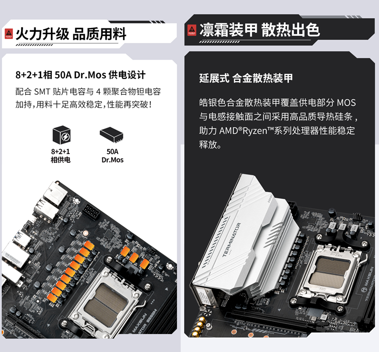 強悍性能的背后,是十足的用料。銘瑄Terminator B650M WIFI6主板采用8+2+1相 50A Dr.Mos 供電設(shè)計,配合高品質(zhì)的SMT貼片電容與聚合物鉭電容,能夠為AMD 銳龍?zhí)幚砥魈峁┓(wěn)定且強勁的電力支持。散熱方面更是誠意滿滿,皓銀色合金散熱裝甲覆蓋供電部分MOS與電感接觸面之間采用高品質(zhì)導(dǎo)熱硅條,如同給核心部件穿上 “降溫鎧甲”,助力AMD銳龍?zhí)幚砥餍阅芊(wěn)定,為用戶提供可靠的使用體驗。