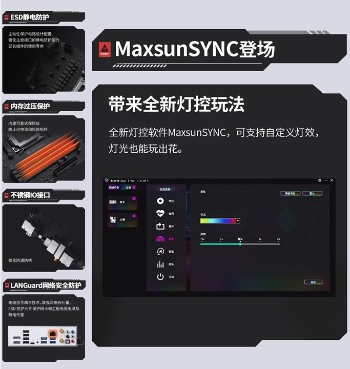 除此之外,貼心設(shè)計讓裝機與使用更省心。主板內(nèi)置了Debug自檢燈,遇到故障一鍵排查;一鍵重置CMOS按鍵,哪怕是新手裝機,遇到問題也能快速排查,裝機過程更順暢;全新燈控軟件 MAXSUN SYNC 更是顏值加分項,支持多種自定義燈效模式,打造專屬電競氛圍,讓主機不僅是性能利器,更是桌面顏值擔(dān)當(dāng)。