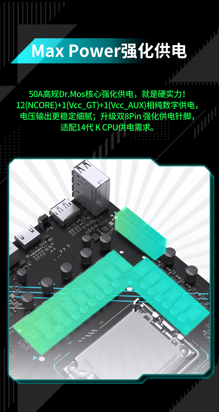 銘瑄B760M GAMING WIFI ACE D4 II主板,供電方面采用了12+1+1相純數字供電設計,配合50A高規Dr.Mos核心,能實現更穩定細膩的電壓輸出,為處理器提供穩定的強勁動力。同時,主板升級雙 8Pin CPU 供電接口,進一步強化供電穩定性,即便處理器處于高負載運行狀態,也能從容應對。搭配大面積銀霜白合金散熱裝甲,高效驅散供電模塊產生的熱量,避免因高溫導致的卡頓、重啟等問題,讓每一次游戲激戰都流暢到底。