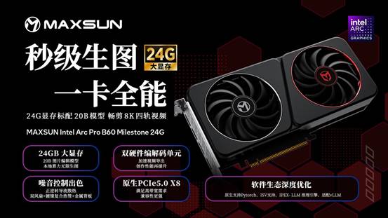無論是追求秒級生圖、流暢剪輯的內(nèi)容創(chuàng)作者,還是追求更強(qiáng)悍AI性能、需要搭建多卡同步運算環(huán)境的高階算力用戶,銘瑄 Intel Arc Pro B60系列顯卡都提供了值得信賴的解決方案。24G版本的MAXSUN Intel Arc Pro B60 Milestone 24G顯卡以高性價比助力靈感實時落地,雙GPU 48G版本的MAXSUN Intel Arc Pro B60 Dual 48G Turbo則以雙芯充沛算力勝任更高階的AI推理與開發(fā)任務(wù)。想要體驗全新流暢創(chuàng)作之旅,或構(gòu)建本地AI算力平臺的用戶,歡迎前往銘瑄京東自營旗艦店了解更多詳情與選購!
