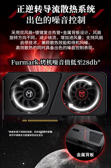 在散熱與靜音方面,該卡采用了正逆轉(zhuǎn)導(dǎo)流散熱系統(tǒng),配備雙風(fēng)扇、鍍鎳復(fù)合熱管與金屬背板,在確保高性能持久釋放的同時,將運行噪音控制在低水平,讓創(chuàng)作過程更專注。