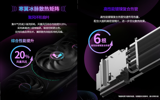 強悍性能的背后,離不開冷靜可靠的散熱保障。銘瑄為這款顯卡量身打造了寒翼冰脈散熱矩陣,聚風(fēng)環(huán)形扇葉能集中氣流、減少湍流損耗,風(fēng)量風(fēng)壓綜合性能提升 20%,搭配高端進(jìn)口滾珠軸承,噪音控制更為出色;高性能鍍鎳復(fù)合熱管快速傳導(dǎo)熱量,搭配大面積高密度鰭片,進(jìn)一步優(yōu)化散熱效果。配合風(fēng)扇啟停技術(shù),低負(fù)載時風(fēng)扇休眠靜音省電,高負(fù)載時即刻滿負(fù)荷運轉(zhuǎn)強效散熱,即便在《惡意不息》四人聯(lián)機長時間鏖戰(zhàn)的高負(fù)載場景下,也能保持穩(wěn)定運行,性能不打折。