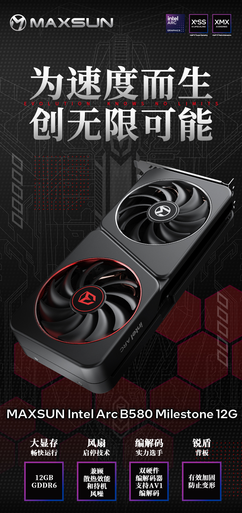 如果說處理器與主板決定了主機的基礎性能,那么顯卡就是暢玩3A游戲大作的關鍵。MAXSUN Intel Arc B580 Milestone 12G 顯卡,不僅擁有強悍的圖形性能,還在外觀設計與散熱表現上精心打磨,并且支持英特爾即將上線的XeSS 3多幀生成技術,實現幀率跨越式提升,高度適配緊湊型主機的使用需求。